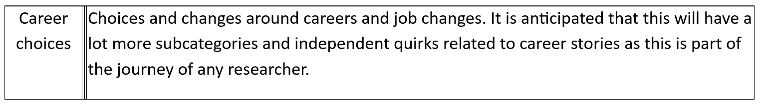 The most important thing to do if coding is to create descriptions for your codes. It is easy to get carried away labeling data without giving it much thought, but adequate descriptions will help you identify what is significant in your data and reduce confusing and energy-sapping duplication of codes. Your description should enable you to understand not only what kinds of things are labelled with this code, but also what should not be labelled with this code. You could also direct yourself to alternatives that give yourself reminders in your description. Here’s my description of the Career choices quirk in the Qualitative researcher journeys project.